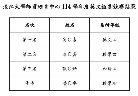 淡江大學師資培育中心114學年度英文板書競賽結果