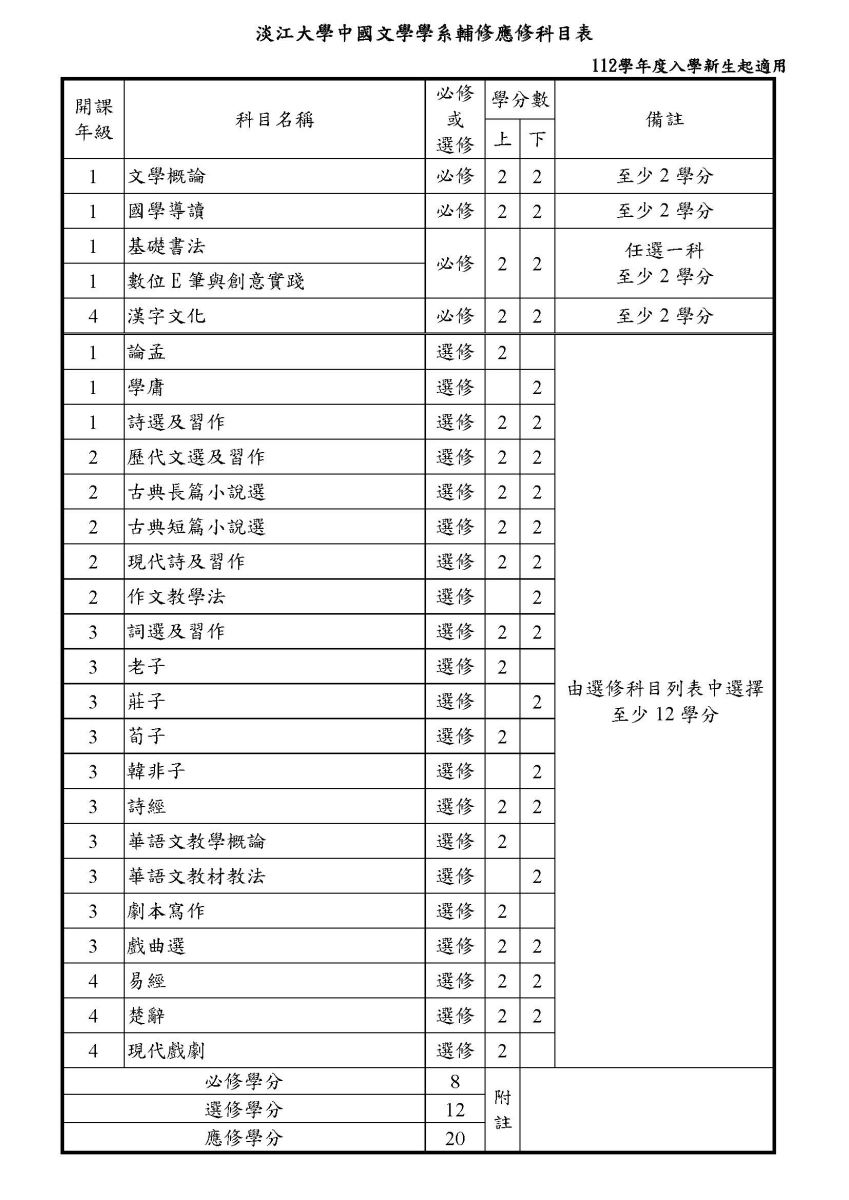 中文系所規定128畢業學分,其中20學分為自由選修學分,修讀外系輔修之20學分可算入自由選修學分計算。
